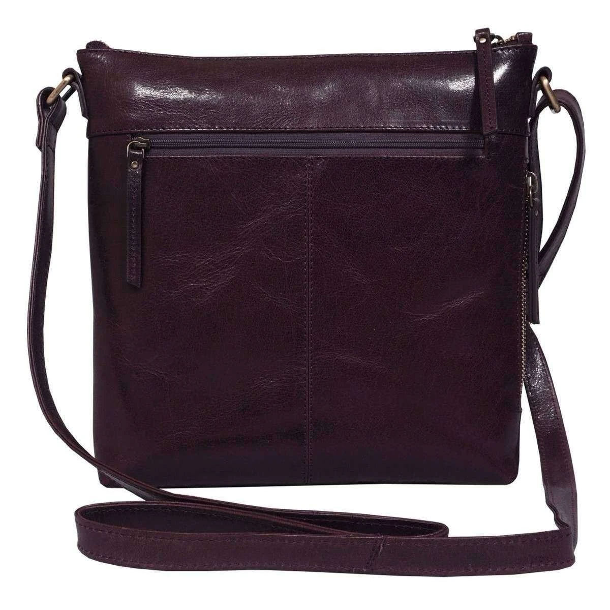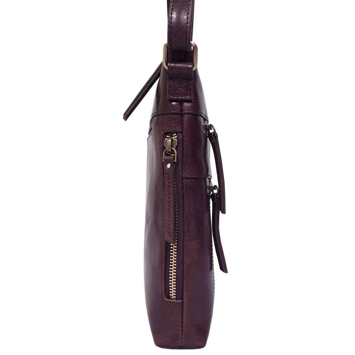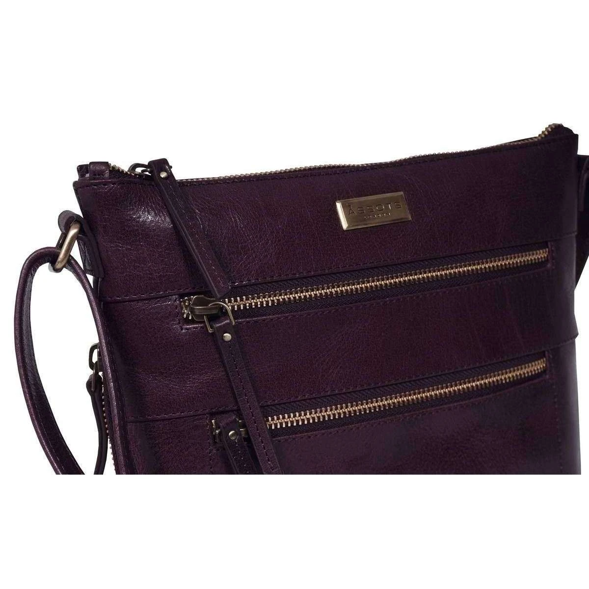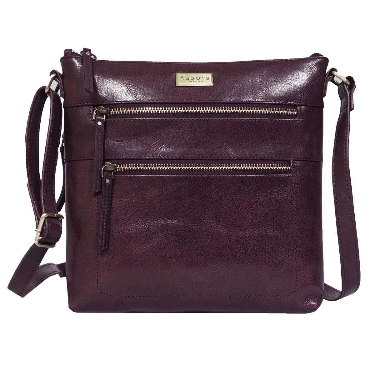 This women’s cori waxy vintage crossbody bag has been made from 100% vegtable tanned waxy leather, featured in a purple colour and is from the brand Assots London. It measures 25cm(height) x 26cm(width) x 4cm(depth). All the bags come complete with assots london packaging. The Assots London Cori Waxy Vintage Crossbody Bag – Plum Purple is a sleek and lightweight accessory, perfect for everyday use. This elegant bag is delicately handcrafted with real leather in a simple yet stylish design. The spacious main compartment is lined with a cotton fabric and is secured by a zip top closure. It conveniently has two zip pockets at the front, one at the side and also at the back for extra storage and quick access to valuables such as keys. The easy adjustable shoulder strap makes it hands free and comfortable to carry all day.