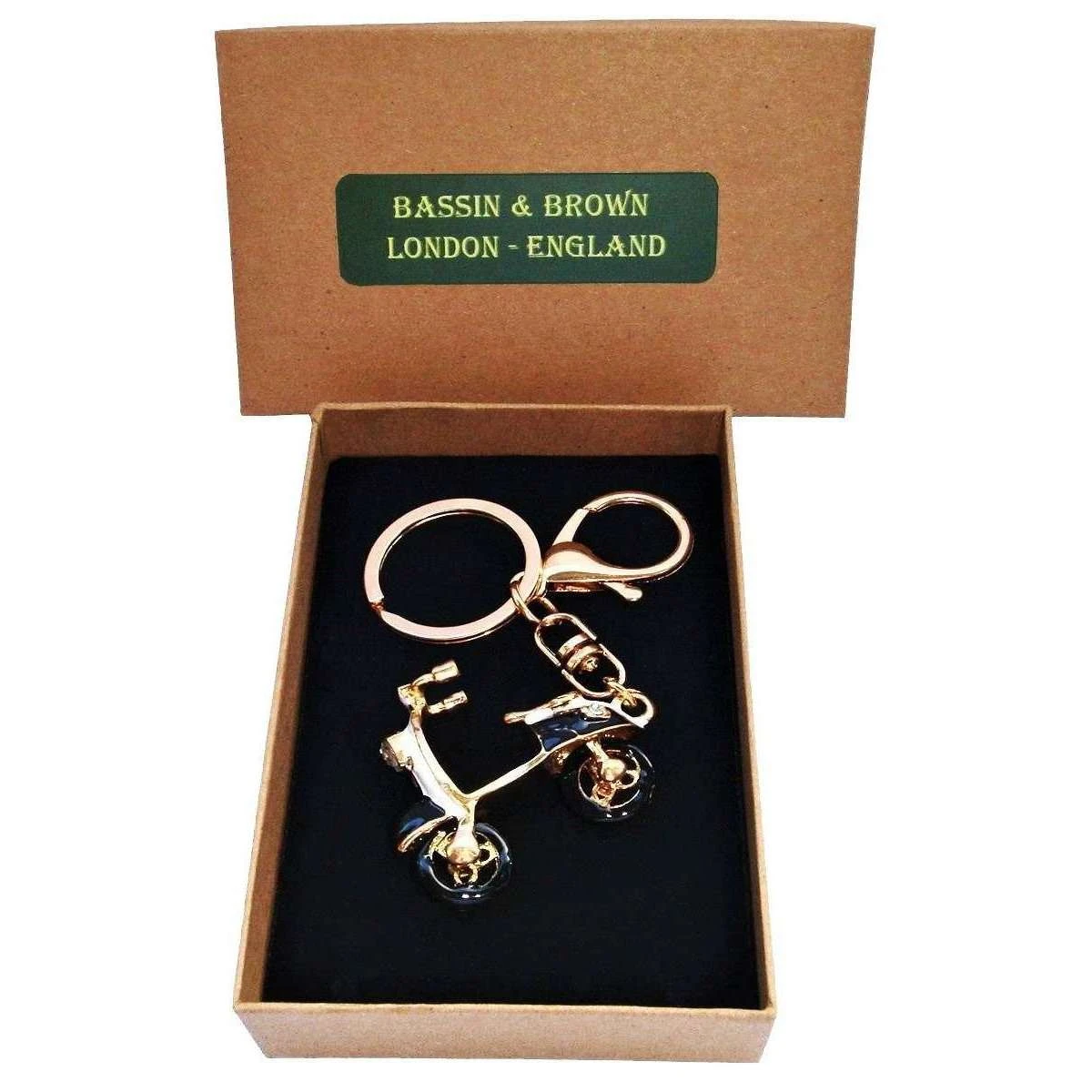 This scooter key ring for men is fashioned by the brand Bassin and Brown in a black colour and is made from gold zinc alloy, crystals and enamel. It measures 10cm(length). All the keyrings come complete with bassin and brown packaging. The Bassin and Brown Scooter Key Ring – Black/White/Gold is perfect for holding your keys stylishly and safely together. Light weight and comfortable, this Scooter keyring is highly detailed with movable wheels and clear crystal light features. Approximately 4.5cm in length, this piece is attractive, sturdy and durable. Elevate your keyring game and highlight your unique taste with this stylish piece. Perfect gift idea for any occasion.