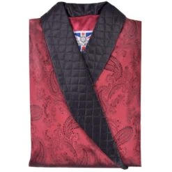 Introducing this men’s clarke short smoking jacket by Bown of London, it is manufactured from polyester in a claret burgundy colour. Also the claret burgundy dressing gown is designed in a paisley pattern, All the dressing gowns come complete with bown of london tags. The Bown of London Clarke Short Smoking Jacket – Claret Burgundy has two rather large deep pockets and an adjustable waistband to suit your comfort. Ideal for relaxing in abolsute style as the contrasting quilted shawl collar is sure to stand out.
