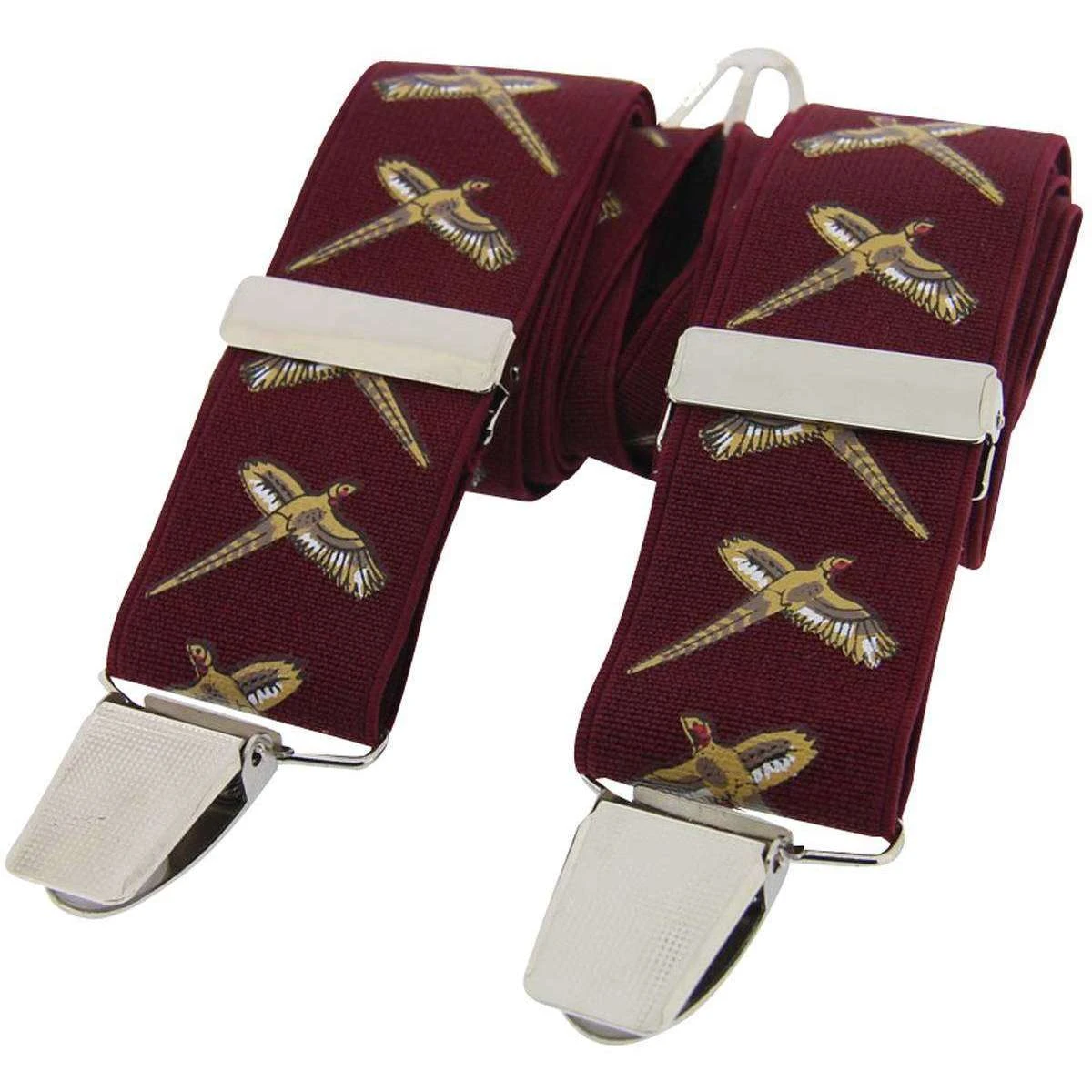 Fine 35mm elastic is used to craft these flexible braces to ensure comfort and support. Inspired by the countryside, these David Van Hagen braces are a must-have as they are decorated by flying pheasants. Their stylish burgundy colour is sure to contrast wonderfully with any shirt colour, making them a must-have for any contemporary gentleman. Presented in a David Van Hagen presentation box, these braces are certain to make an impressive gift.