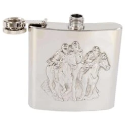 This striking horse racing 6oz hip flask from David Van Hagen offers you with a wonderful way of carrying your favourite drink. Having been crafted from the finest stainless steel, this piece has been majestically designed with a supremely detailed embossed horse and jokey before being finished with a shiny effect. Featuring a capacity of 6oz, which is approximately 170ml, this eye-catching hip flask comes complete in a David Van Hagen presentation box to make an exceptional choice of gift for any man.Â