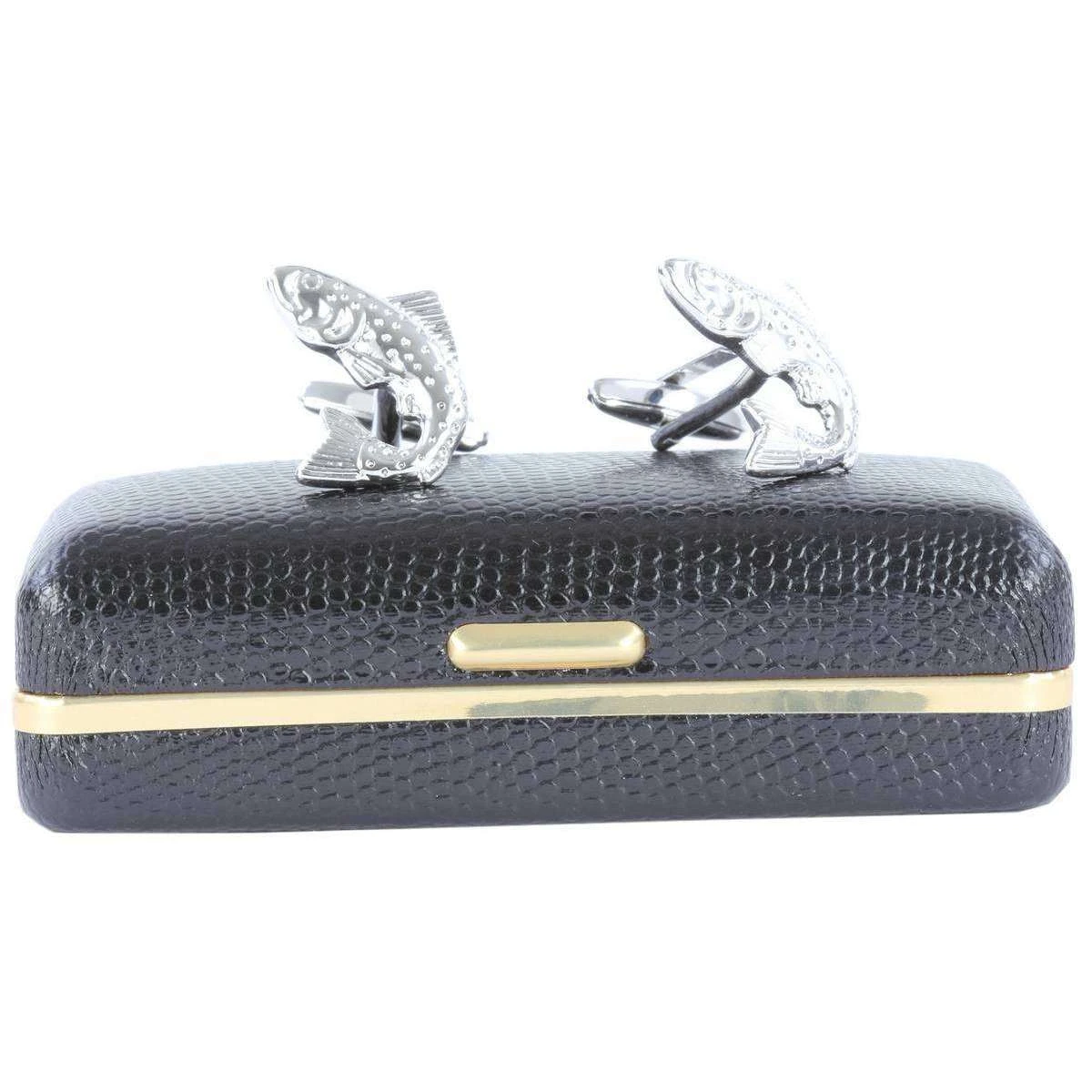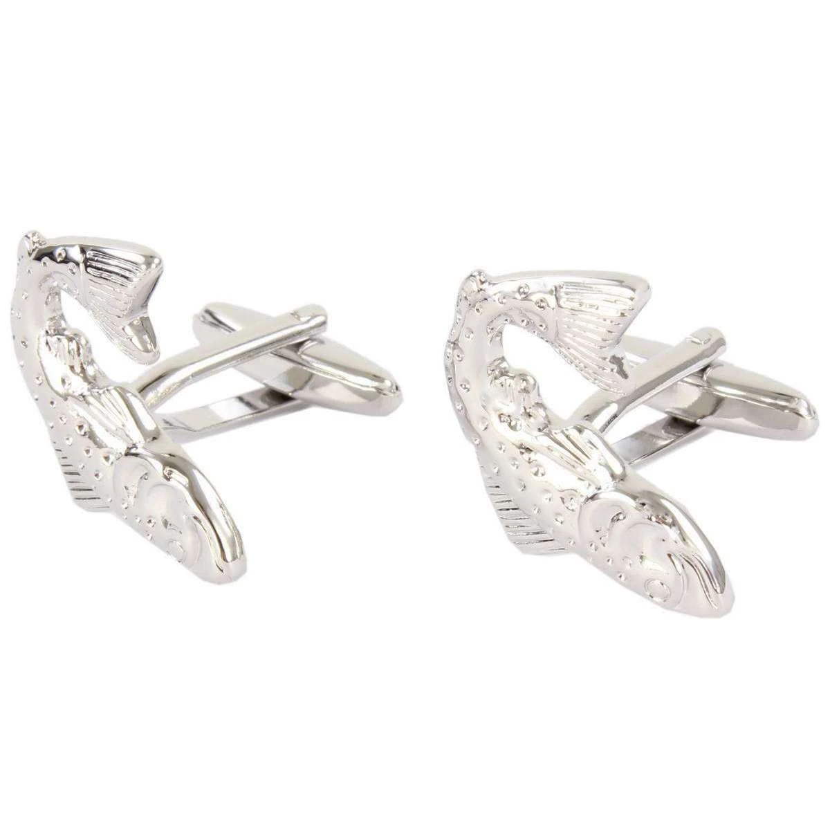 Stunningly shinned, these salmon cufflinks from David Van Hagen are a superb choice to accessorise your formal attire. Delicately crafted from brass and plated with rhodium they are certainly a durable pair that is perfect for any gentlemans collection. Their swivel t-bar back ensures that your cuffs are secured for those special occasions and will do so in style. These stunning cufflinks come complete in a David Van Hagen presentation box making them an ideal gift.