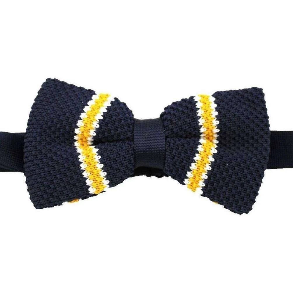 Introducing this men’s striped knitted polyester bow tie by David Van Hagen, it is manufactured from 100% polyester in a navy/yellow/white colour. Also the navy/yellow/white bow tie is designed in a striped pattern, All the bow ties come complete with david van hagen tags. The David Van Hagen Striped Knitted Polyester Bow Tie – Navy/Yellow/White will make a lovely addition to any gentleman’s collection as the quirky pattern and contrasting colours will look great when paired with any smart outfit. It has been crafted from quality materials that are long lasting and durable.