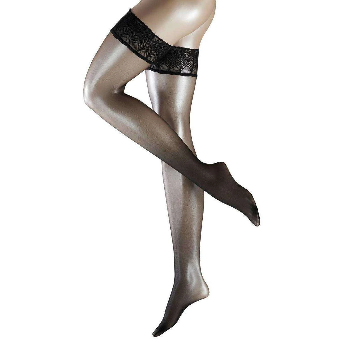 Using black 61% polyamide and 39% elastane with an 84% polyamide and 16% elastane band, these lunelle 8 denier ultra-transparent shimmer stay up stockings by Falke are perfect for women and a must have. Also the black stockings are designed in a plain pattern, All the stockings come complete in falke packaging. The Falke Lunelle 8 Denier Ultra-Transparent Shimmer Stay Up Stockings – Black are a luxuriously fine pair featuring an ultra-transparent look with a shimmer finish to give your legs a soft, elegant look. These stay-ups exhibit a delicate texture with a non laddering finish to ensure they reach maximum durability. Adding decoration to this fine pair is a gorgeous peacock feather motif that adds pure luxury and style. A silicone coating provides non slip as well as non laddering toes and soft seems all ensure the utmost quality.