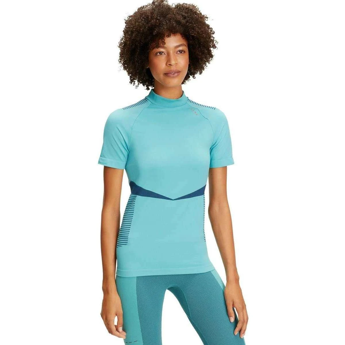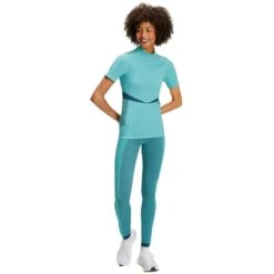 This women’s running high neck t-shirt by the brand Falke is made from 92% polyamide and 8% elastane and is showcased in turquoise. Also the turquoise sports t-shirt is designed in a block pattern, It is recommended to wash at 40 degrees, do not tumble dry, do not iron, do not dry clean and do not bleach to keep this sports t-shirt in good condition. All the sports t-shirts come complete with falke packaging. The Falke Running High Neck T-Shirt – Turquoise has many features which ensure it to be a great running piece. It has mesh structures in the back and armpits to improve moisture absorption. Freedom of movement is ensured with its ribbed structure on the side and shoulders, increasing comfort. Reflective elements help with safety at night and its waistband ensures an optimal fit.